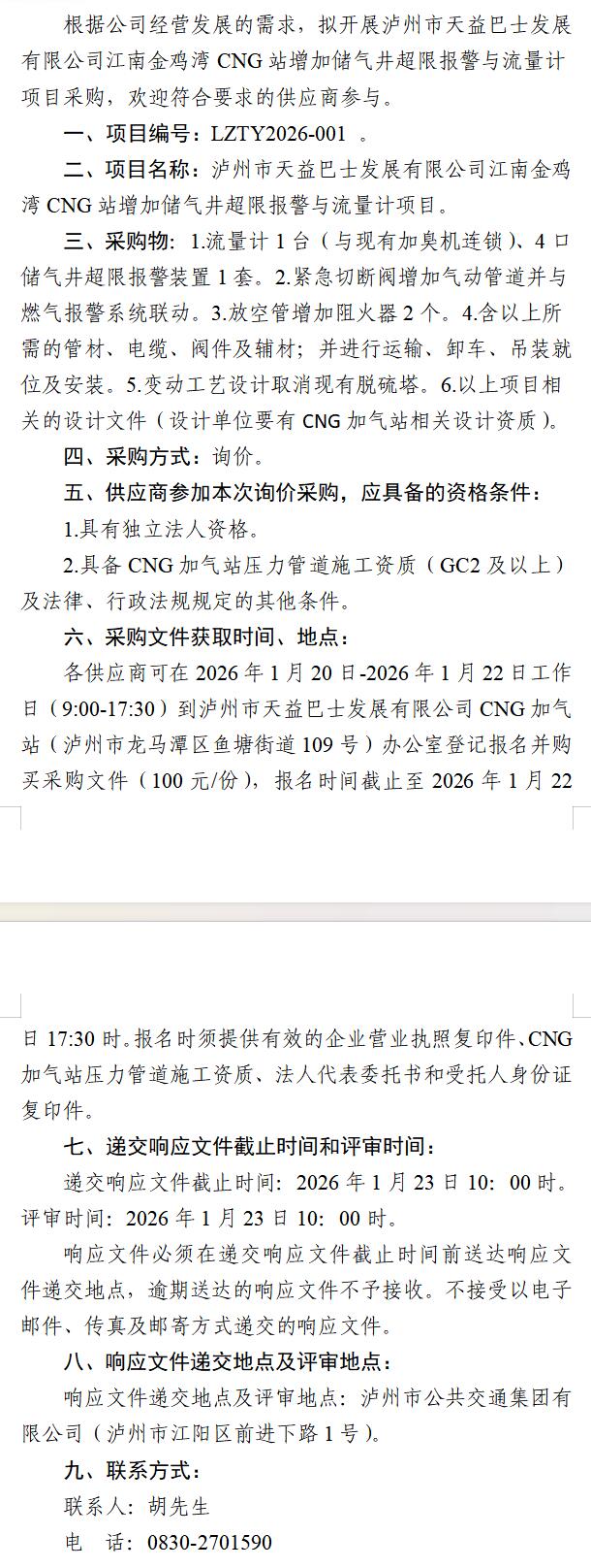 瀘州市天益巴士發(fā)展有限公司江南金雞灣CNG站增加儲氣井超限報警與流量計項目采購公告